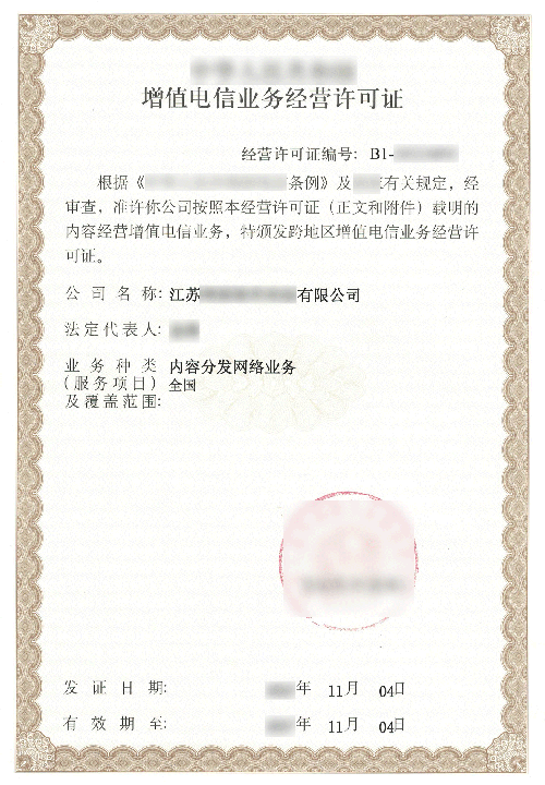 • 资质全称:第一类增值电信业务许可证-内容分发网络业务