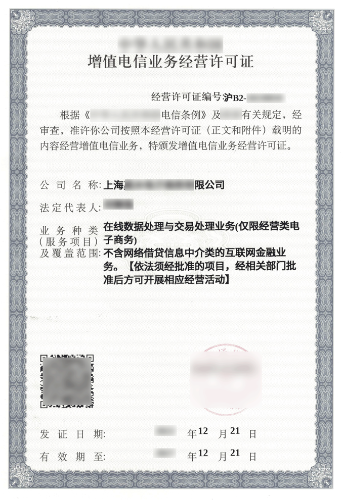 资质全称:第二类增值电信业务许可证-在线数据处理与交易处理业务